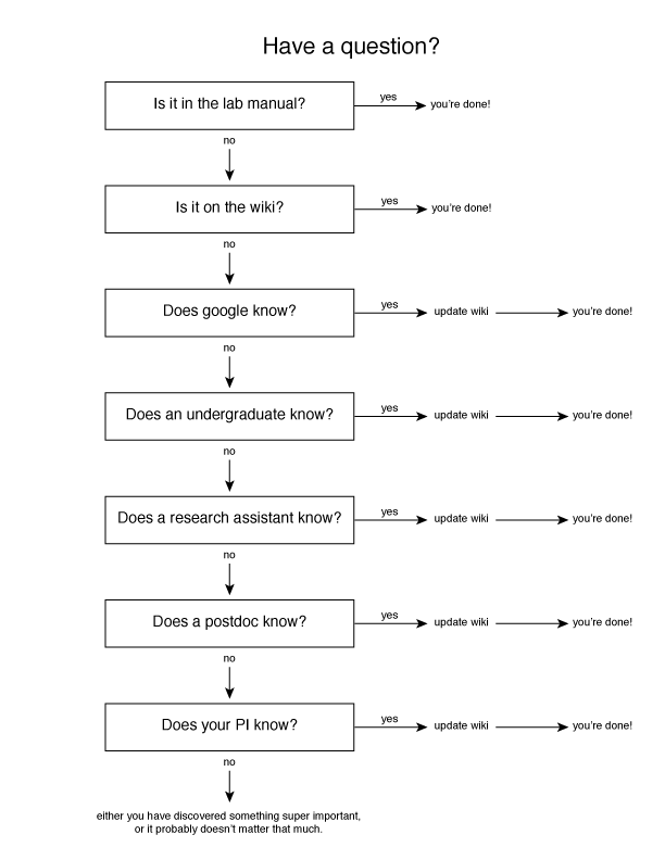 I put together this handly little chart to encourage people to check the locations where the information might be found (like, say, the internet). And equally importantly to encourage them to update the lab wiki when they find it. Let's see how it works!
